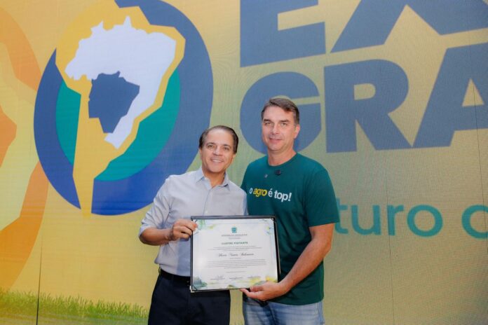 O deputado estadual Coronel David (PL) entregou, nesta quinta-feira (9), o Diploma de Ilustre Visitante ao senador Flávio Bolsonaro. A homenagem ocorreu durante a programação da Expogrande, realizada no Parque de Exposições Parque de Exposições Laucídio Coelho, em Campo Grande.