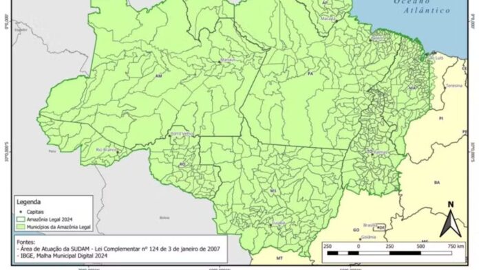 A Amazônia Legal abrange mais de 5 milhões de km² — cerca de 59% do território brasileiro — e inclui nove estados: Acre, Amazonas, Roraima, Rondônia, Pará, Amapá, Tocantins, Maranhão e Mato Grosso. Mato Grosso do Sul não faz parte da região. Segundo o IBGE, vivem na Amazônia Legal 56% da população indígena do país. O conceito foi criado em 1953 para direcionar políticas públicas de desenvolvimento para a região.