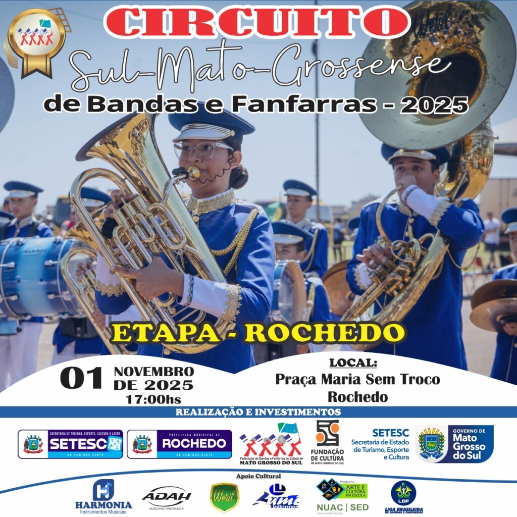 “Cada etapa do circuito representa o esforço e a dedicação de centenas de músicos, maestros e coreógrafos. Em Rochedo, mais uma vez, veremos o talento e a paixão pela música instrumental transformarem o espaço público em um grande palco de cultura e cidadania sul-mato-grossense”, destacou Fábio Costa.