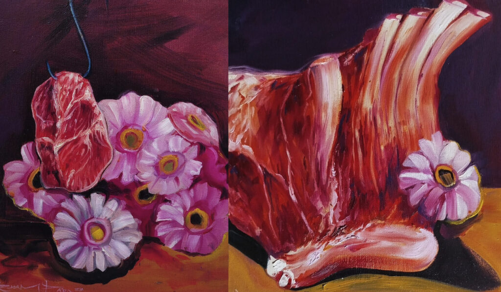 Mais do que representar a carne, Ryan a trata como metáfora existencial. Suas pinturas evocam rituais, cortes, texturas e gestos que expõem o limite entre o sagrado e o brutal. “O açougue, para mim, é um altar onde se celebra a vida, o corpo e, ao mesmo tempo, a morte. Pinto como quem manipula um corpo: esgarço, sobreponho camadas, deixo a carne vibrar na cor”, descreve.