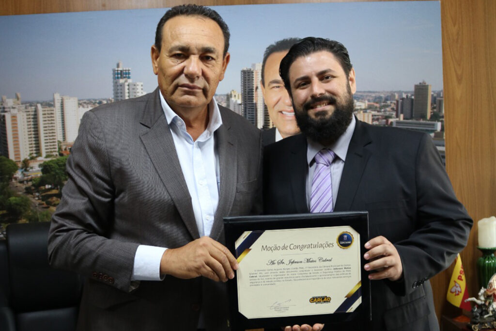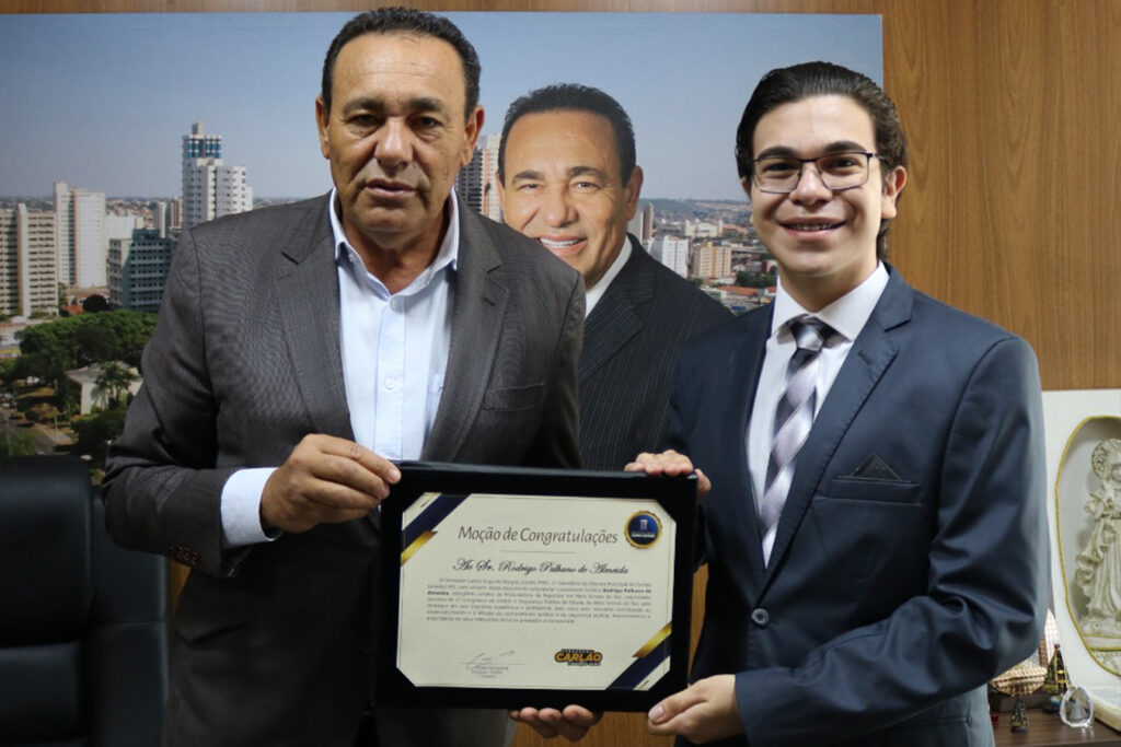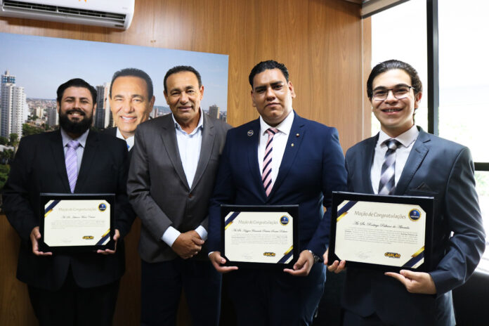 Em reconhecimento à sua contribuição cívica e acadêmica, os estudantes de direito Rodrigo Palhano, Jeferson Matos e Higgor Fernando receberam, na manhã desta quarta-feira (15), uma Moção de Congratulações na Câmara Municipal de Campo Grande. A homenagem, proposta pelo vereador Carlos Augusto Borges (Carlão PSB), 1⁰ Secretário da Mesa Diretora, celebra a idealização e organização do 1º Congresso de Direito e Segurança Pública do Estado de Mato Grosso do Sul, que ocorreu em maio.