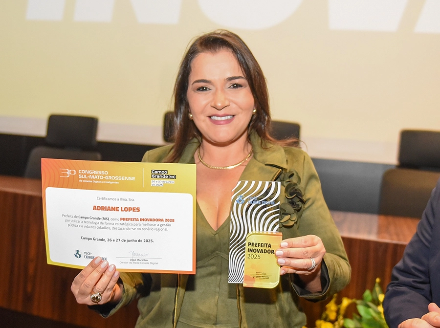 Ao final do congresso, Adriane Lopes foi reconhecida com o selo Prefeita Inovadora 2025, graças ao projeto “Digitalização da Avaliação de Risco de Queda de Árvores”, sistema que permite a gestão inteligente da arborização urbana via Arbolink,, tecnologia que previne riscos e traz mais segurança à população.