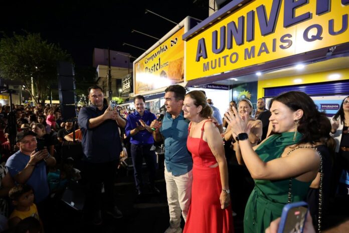 Dourados abriu oficialmente, na noite de terça-feira (2), o “Natal Encantado”, reunindo o maior público já registrado na abertura dos festejos natalinos da cidade. Em um palco montado na Praça Antônio João, o prefeito Marçal Filho celebrou o momento ao lado da primeira-dama Patrícia Leite, da vice-prefeita Gianni Nogueira, de autoridades municipais, deputados e representantes da Associação Comercial.