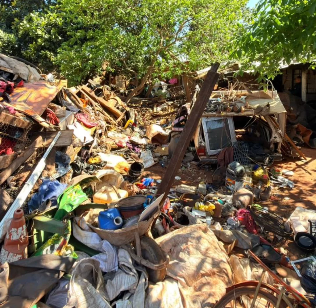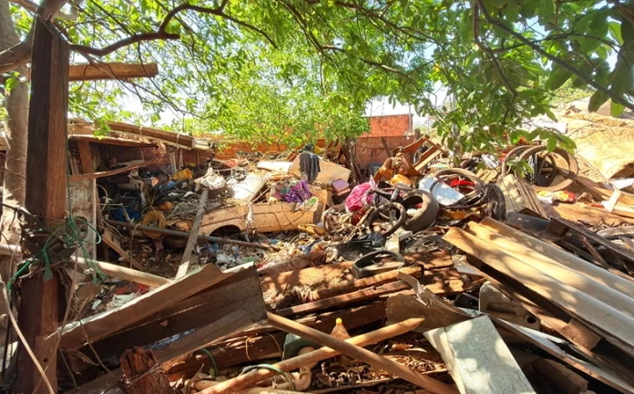 Segundo o relatório da Coordenadoria de Vigilância em Saúde Ambiental (CVSA), o imóvel era ocupado por um morador conhecido na região, que, mesmo após firmar termos de compromisso com a prefeitura para realizar a limpeza, manteve o espaço em situação crítica. O documento, datado de junho deste ano, descreve o cenário encontrado como “caótico”, com materiais empilhados acima de dois metros de altura, incluindo pneus, ferragens, madeiras e até carcaças de eletrodomésticos.