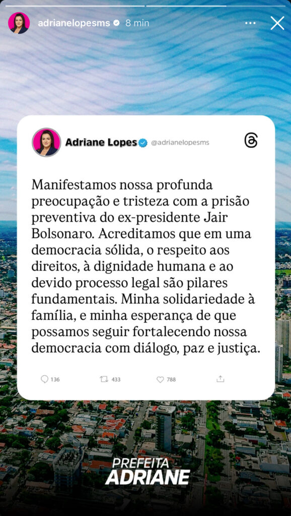 Agora, diante da prisão preventiva do ex-presidente, a prefeita reaparece em alinhamento institucional, reforçando a defesa do devido processo legal e expressando solidariedade à família Bolsonaro.
