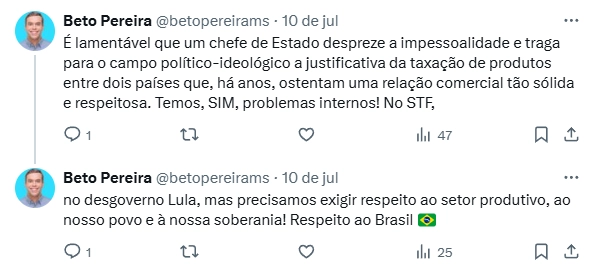 “É lamentável que um chefe de Estado despreze a impessoalidade e traga para o campo político-ideológico a justificativa da taxação de produtos entre dois países que, há anos, ostentam uma relação comercial tão sólida e respeitosa. Temos, sim, problemas internos! No STF, no desgoverno Lula, mas precisamos exigir respeito ao setor produtivo, ao nosso povo e à nossa soberania! Respeito ao Brasil.”