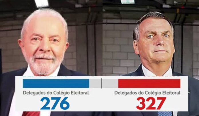 Se o sistema de delegados fosse aplicado na eleição de 2022, Bolsonaro venceria com 327 delegados contra 276 de Lula.