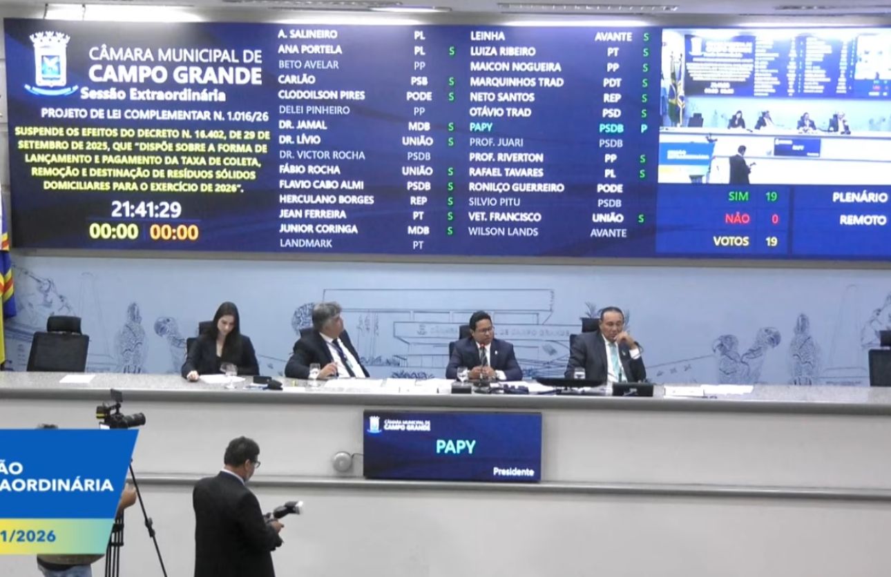 A Câmara Municipal de Campo Grande aprovou, em sessão extraordinária realizada na noite desta segunda-feira (12), o Projeto de Lei Complementar nº 1.016/26, que suspende os efeitos do Decreto nº 16.402, publicado em 29 de setembro de 2025. A proposta, de autoria da Mesa Diretora, veta o aumento da taxa do lixo embutida no IPTU de 2026, o que reduz o valor final do imposto cobrado dos contribuintes.