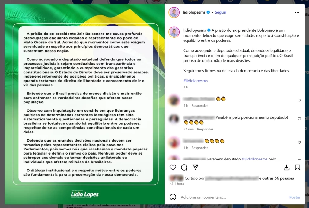 “A prisão do ex-presidente Bolsonaro me causa profunda preocupação enquanto cidadão e representante do povo de Mato Grosso do Sul”, afirmou Lídio. “Acredito que momentos como este exigem serenidade e respeito aos princípios democráticos que sustentam nossa nação.”