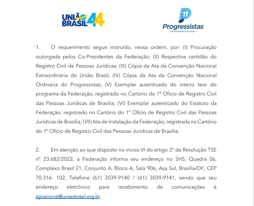 Os partidos União Brasil e Progressistas protocolaram nesta quinta-feira (4) o pedido de registro da federação partidária União Progressista (UP) no Tribunal Superior Eleitoral (TSE). A solicitação reúne toda a documentação exigida pela Resolução nº 23.682/2022 e ainda aguarda análise e decisão da Corte.