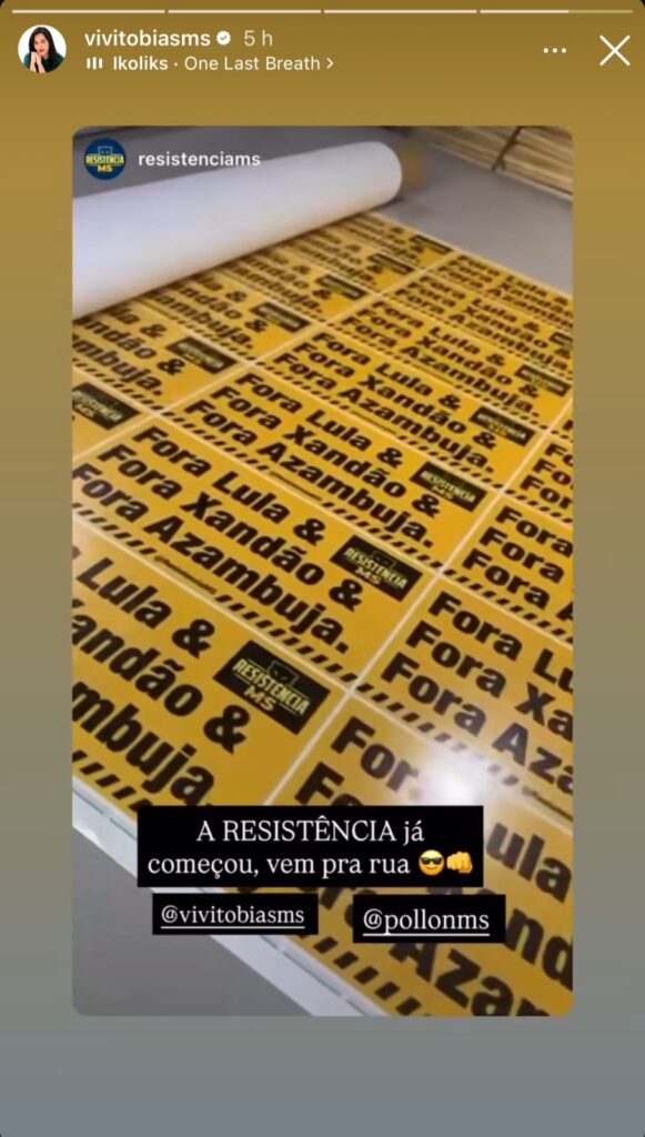 A polêmica começou com uma publicação feita pelo perfil no Instagram @resistenciams, que exibiu o que aparenta ser um adesivo com os dizeres “Fora Lula & Fora Xandão & Fora Azambuja”. O material foi repostado pela ativista e suplente de vereadora pelo PL, Vivi Tobias, o que gerou repercussão entre filiados e apoiadores do partido.