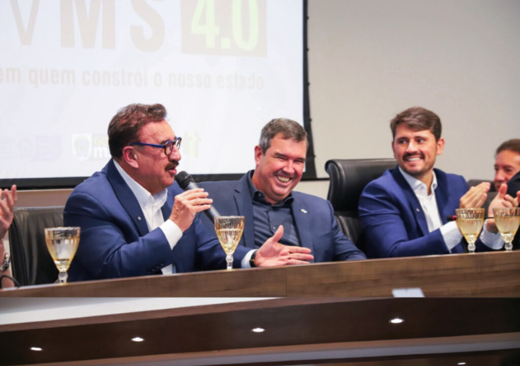 Apresentador Ratinho (à esquerda), governador Eduardo Riedel (centro) e o presidente da ASSOMASUL Thalles Tomazelli (à direita)