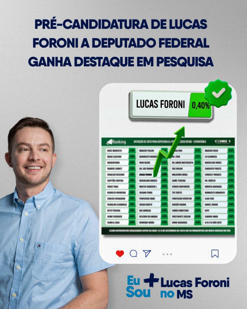 Em entrevista a esta coluna, Foroni ressaltou a importância de ampliar a representatividade da região na Câmara dos Deputados. Mesmo tendo anunciado a pré-candidatura há pouco mais de um mês, seu nome já aparece em levantamentos de intenção de voto, em pesquisa divulgada nesta semana, o chefe do executivo municipal de Rio Brilhante alcançou 0,40% das menções espontâneas, posicionando-se entre os pré-candidatos lembrados pelo eleitorado sul-mato-grossense.