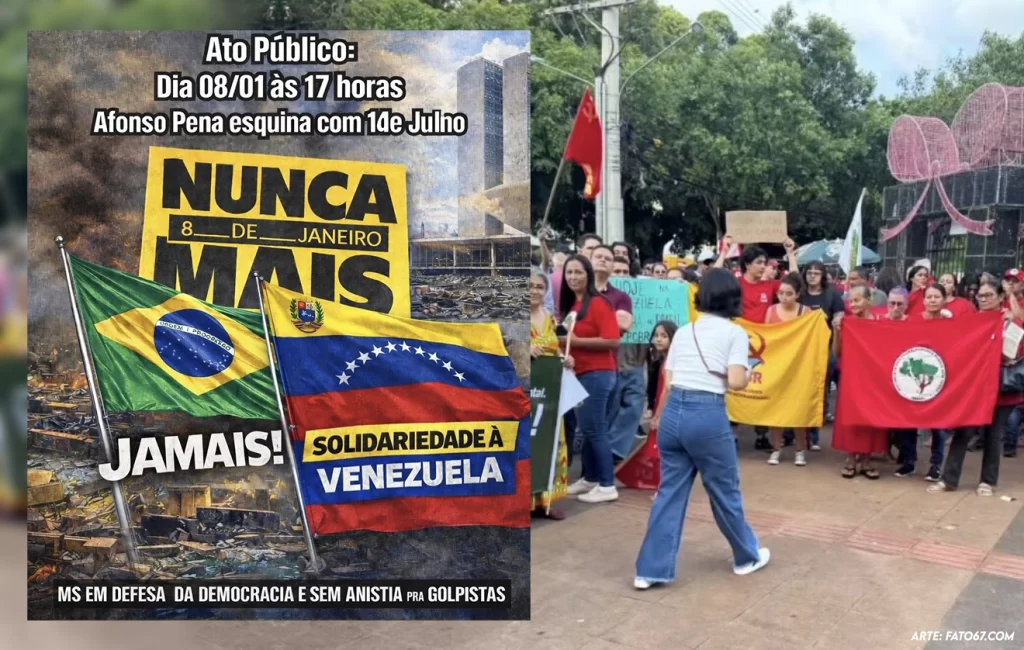 Uma manifestação realizada na tarde da última quinta-feira, dia 8, no Centro de Campo Grande, acabou se transformando em um palanque político-partidário com discursos eleitorais antecipados e defesa explícita de candidaturas para as eleições de 2026. O ato ocorreu na esquina da Rua 14 de Julho com a Avenida Afonso Pena, nas proximidades da Praça Ari Coelho, e reuniu militantes de partidos e movimentos de esquerda sob o slogan “8 de Janeiro Nunca Mais”.