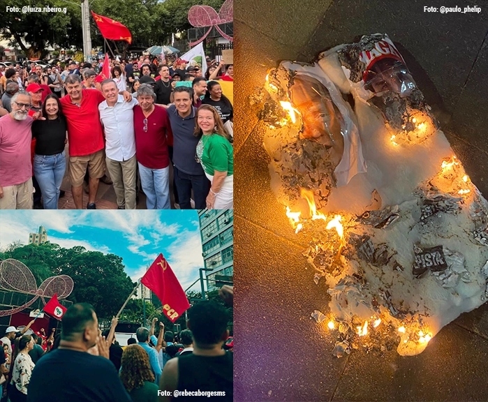 Além dos discursos, um grupo de manifestantes ateou fogo em imagens do ex-presidente dos Estados Unidos Donald Trump e do deputado federal Eduardo Bolsonaro, em um gesto simbólico de protesto político, sem registro de confronto ou intervenção policial no local.