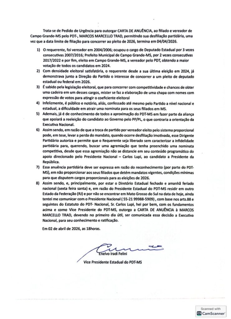 A mudança foi oficializada após a emissão de uma carta de anuência pelo PDT, partido ao qual Marquinhos estava filiado até então. O documento, assinado pelo vice-presidente estadual da sigla, Enelvo Felini, autorizou a desfiliação sem caracterizar infidelidade partidária, argumento utilizado diante da dificuldade do partido em estruturar uma nominata competitiva no estado.