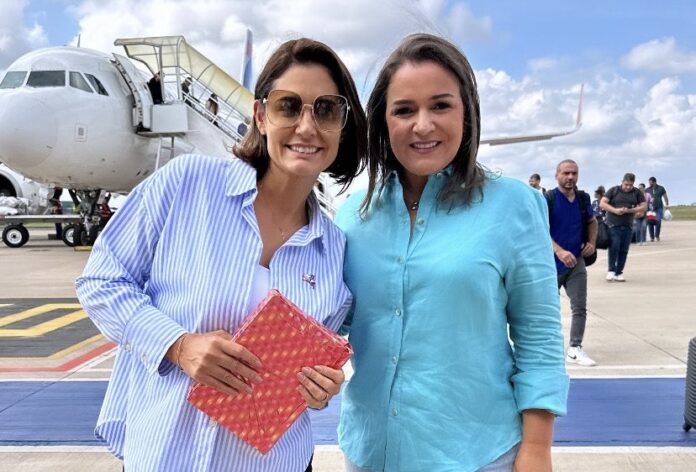 Nesta manhã, a prefeita de Campo Grande, Adriane Lopes (PP), deu as boas-vindas à ex-primeira dama Michelle Bolsonaro, presidente do PL Mulher nacional, no aeroporto da capital. A recepção marca um momento significativo para a consolidação da aliança entre os partidos PP e PL, que estão caminhando para formar uma chapa única nas eleições municipais deste ano.